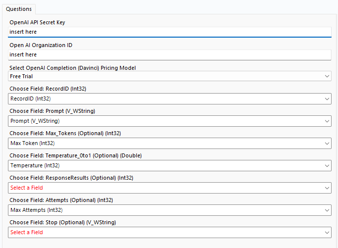 Select Free Trial for the pricing model, choose your Record ID field, and your Prompt field and you are ready to go!