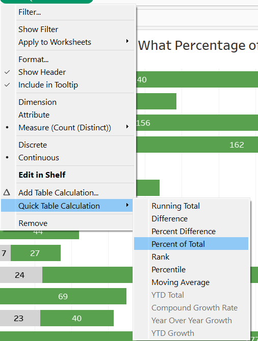 6) Because Percent of Total works across everything in the view, the values shown now represent each bar as a percentage of the entire dataset displayed, not just its sub-category. So we need to edit the table calculation to do this.