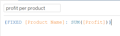 2) We first create a FIXED LOD to return the total profit for each product. This locks the value at the product level so it remains consistent regardless of how the view changes.
