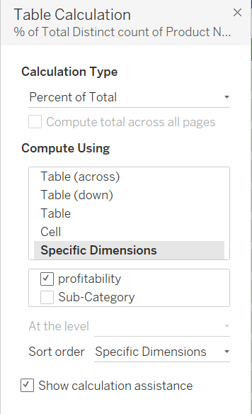 7) To get the correct percentage, the table calculation needs to run within each sub-category rather than across the whole view. This is why I switched the table calculation to Specific Dimensions. By ticking profitability and leaving Sub-Category unticked, the calculation resets for each sub-category. This means Tableau now calculates the percent of total within each sub-category instead of across all products in the dataset.