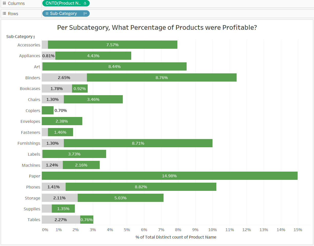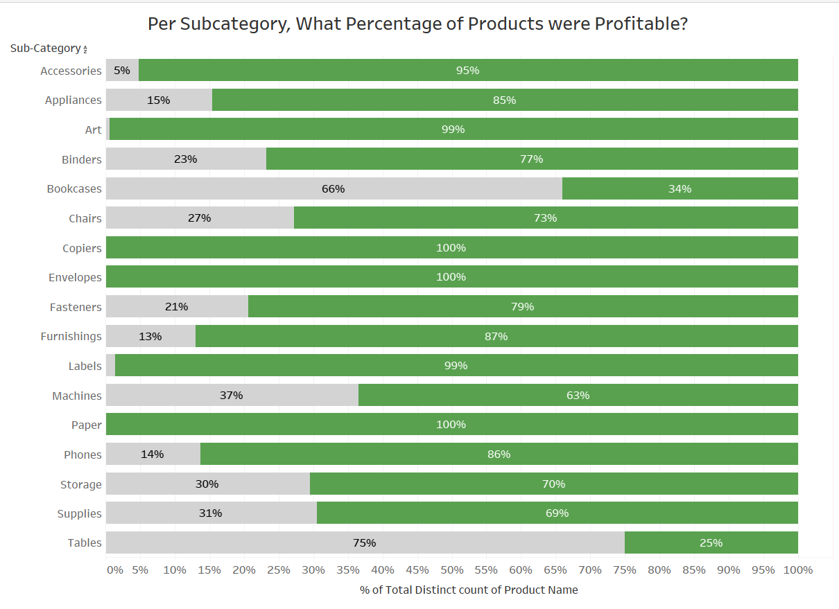 Using the Superstore dataset, we want to find out what percentage of products were profitable within each sub category.