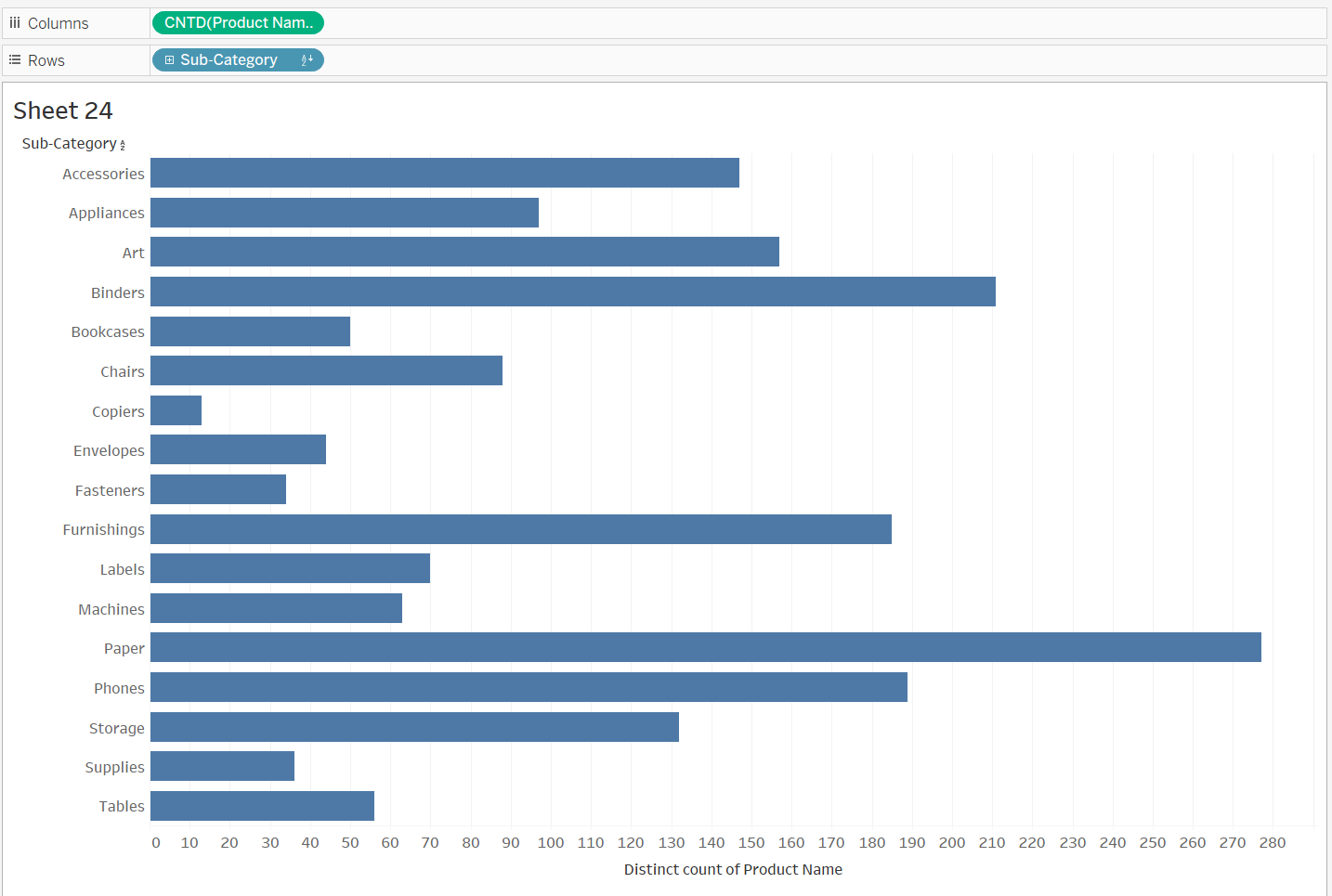1) To begin, Place Sub-Category on the Rows shelf, then add a COUNTD(Product Name) to the Columns shelf to show how many unique products sit within each sub-category.