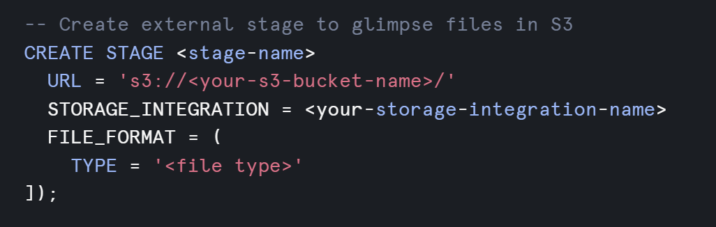 - Create a stage by running the below code with the relevant “<text>” replaced with the relevant details.