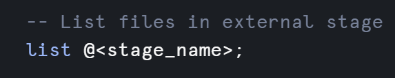 - You can check that the Snowflake/AWS connection by running the below command. It should show you a list of the files in your S3 bucket. This is the usefulness of an external stage. You can view your S3 files within Snowflake.