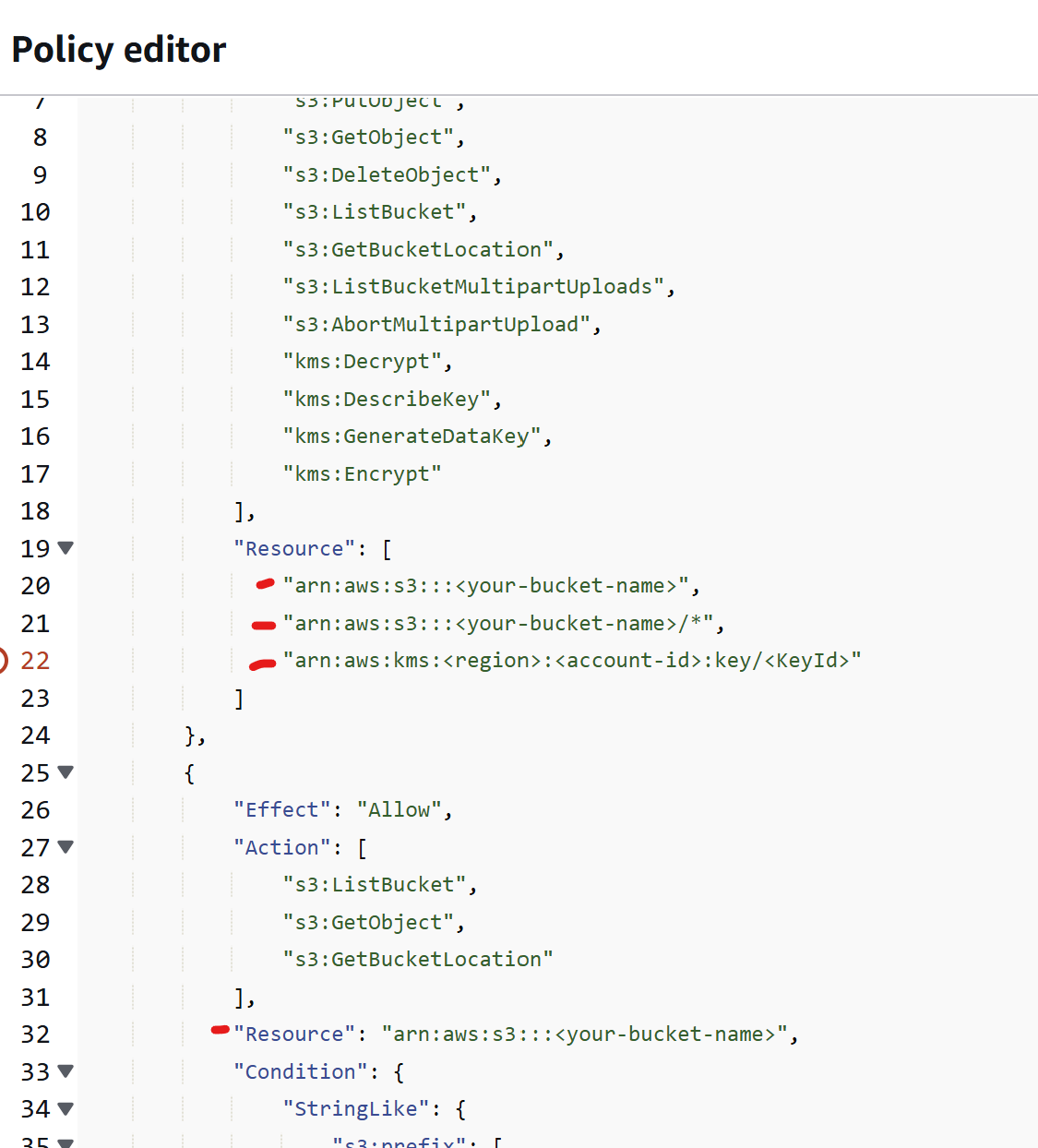 - Create a policy in AWS IAM service. Your existing bucket and key should be linked to this policy using the following JSON configuration. All highlighted lines should contain your relevant details instead of the “<text>”.