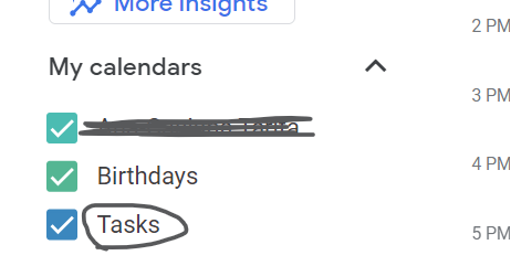 To create a task go to your Calendar> on the right-corner click on Tasks>click on Add a task. After adding your task in the calendar make sure the Tasks option is ticked under My calendars so it can appear in your calendar.