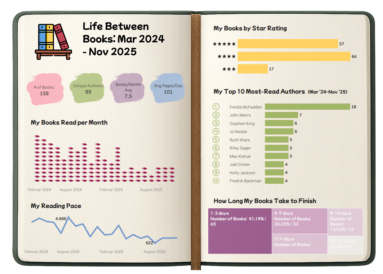 For my final dashboard-week project, I decided to analyse my own reading habits using Goodreads data. It was surprisingly fun to explore things like how many books I read per month on average, how many pages I get through, and which month turned out to be my most productive reading month.