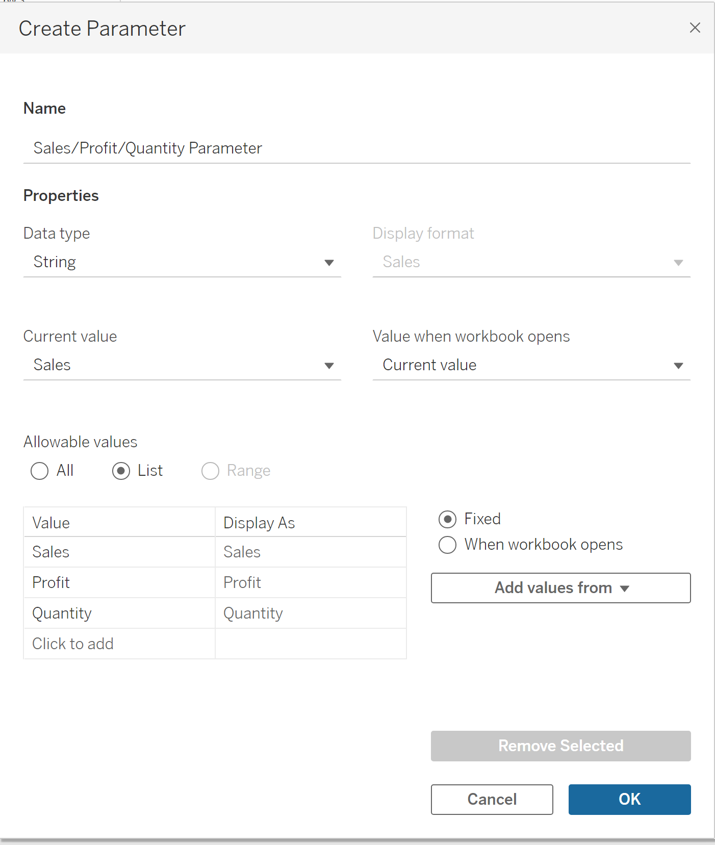 I'm going to be using the Sample - Superstore data so my metrics will be Sales, Profit and Quantity. First step is to create a parameter by clicking the drop down arrow in the data pane. I'm going to call this Sales/Profit/Quantity Parameter. Select string as the data type, click list and add in the values Sales, Profit and Quantity.