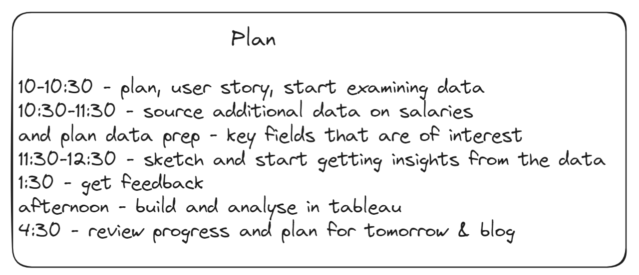 On Thursday, we started on the challenge itself a little later, at 10am, and had to scope out the project and pick our topic in the first half an hour. So my plan for the day was as follows.
