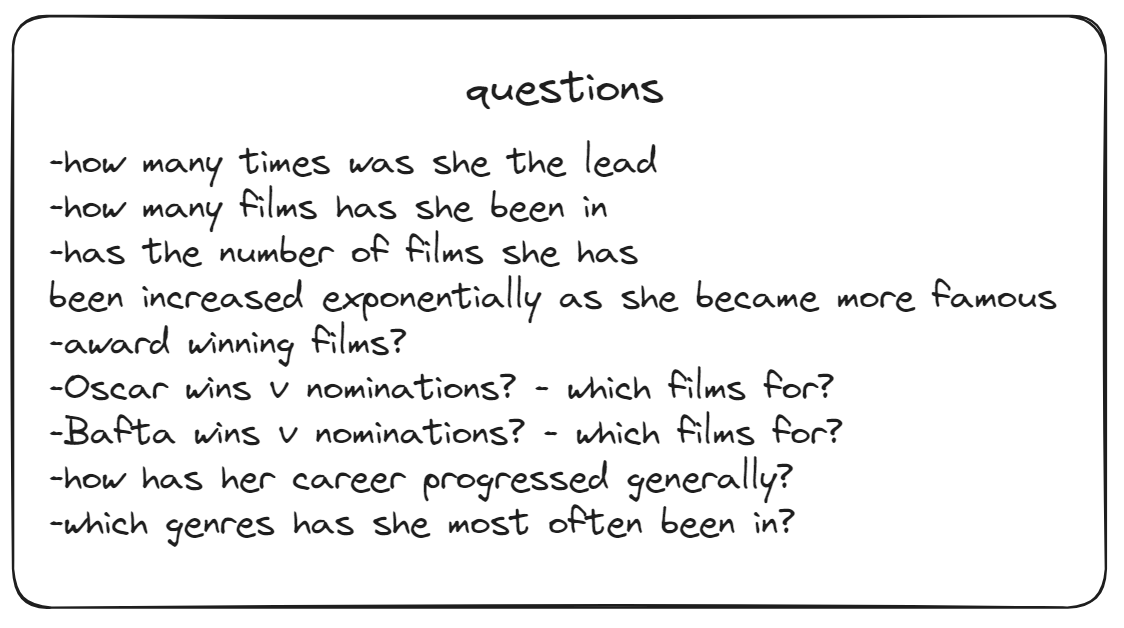 My chosen topic of analysis was the career (through film) of Meryl Streep. As this is a little bit different to usual dashboarding / analysis I am used to, I found it more helpful to start with a list of potential questions rather than a sketch of the visualisations.