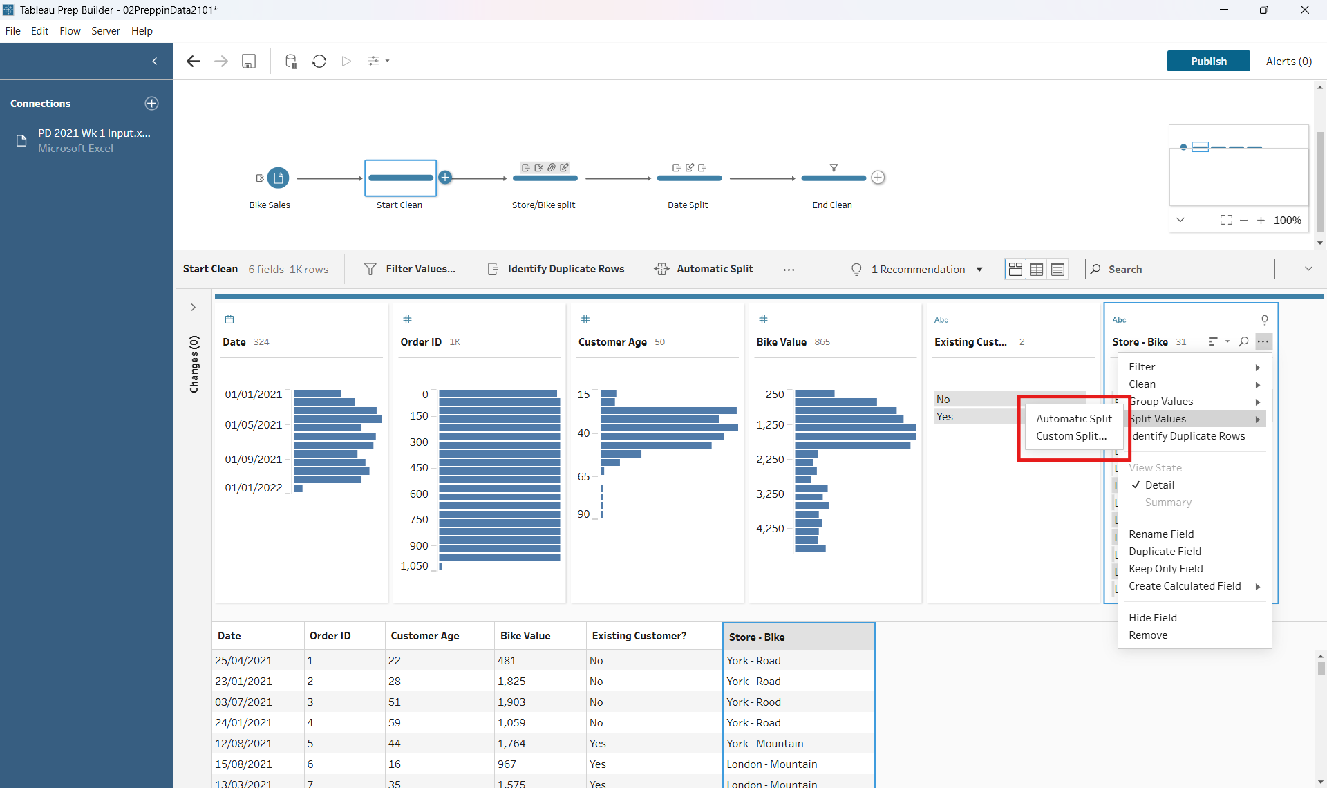 - In Tableau Prep I did this using the ‘Automatic Split’ function, and tidied up the names of the new columns.