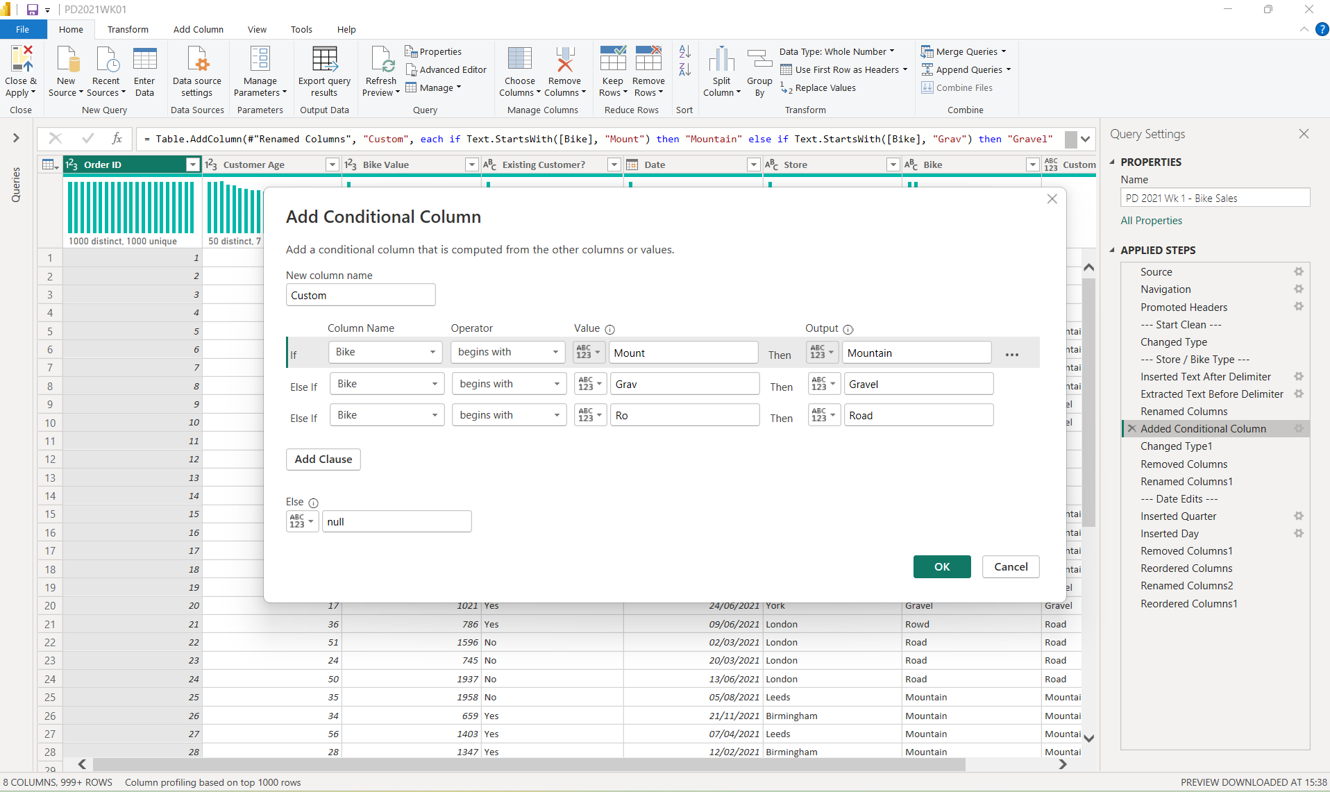 - Unfortunately Power Query doesn’t have the same ‘Group by’ function that Tableau Prep has, so I had to find a way around this. I did this by adding a ‘Conditional Column’, stating what the words should begin with. Luckily given the spelling issues in this data set, this was an effective work around.