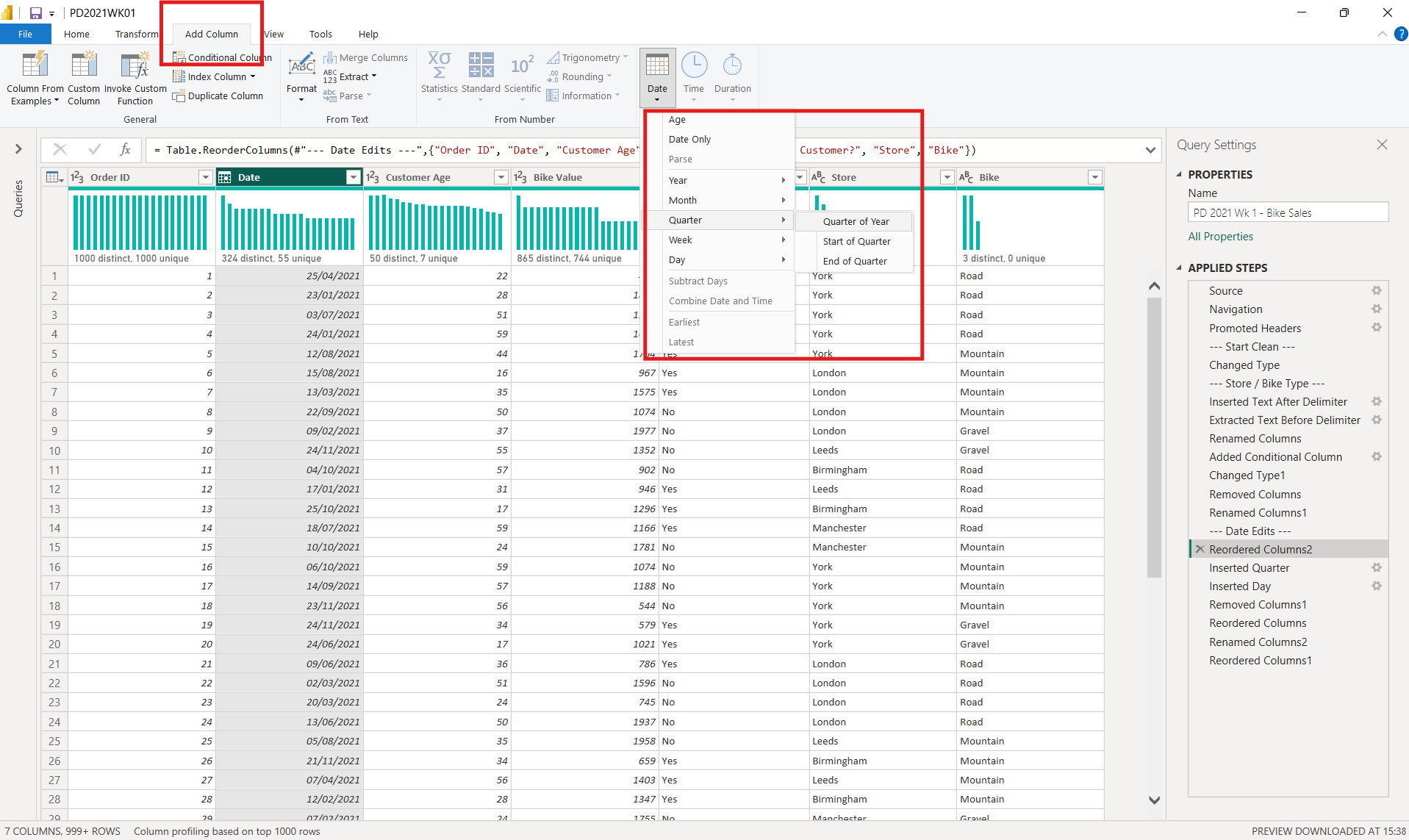 - In Power Query it’s slightly quicker to do this than Tableau Prep, as you don’t need to duplicate any columns. I simply went into ‘Date’ format under ‘Add Column’ and selected Quarter and Day respectively.