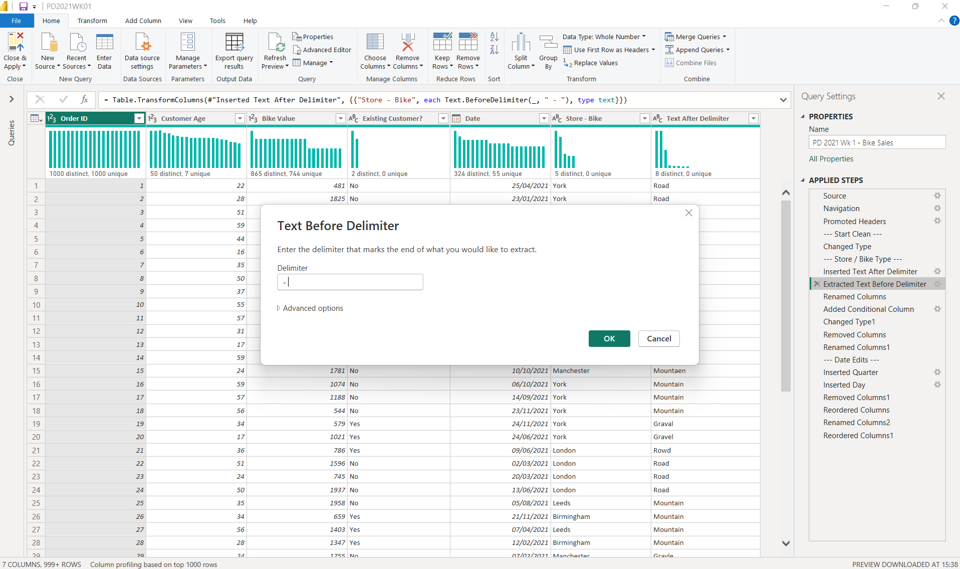 - In Power Query I extracted the text before and after the delimiter, using the delimiter ‘ - ‘