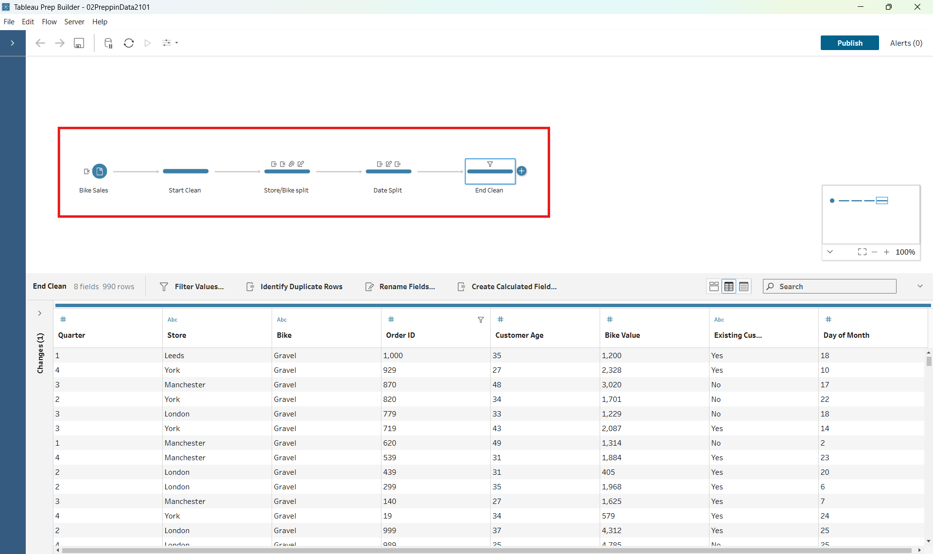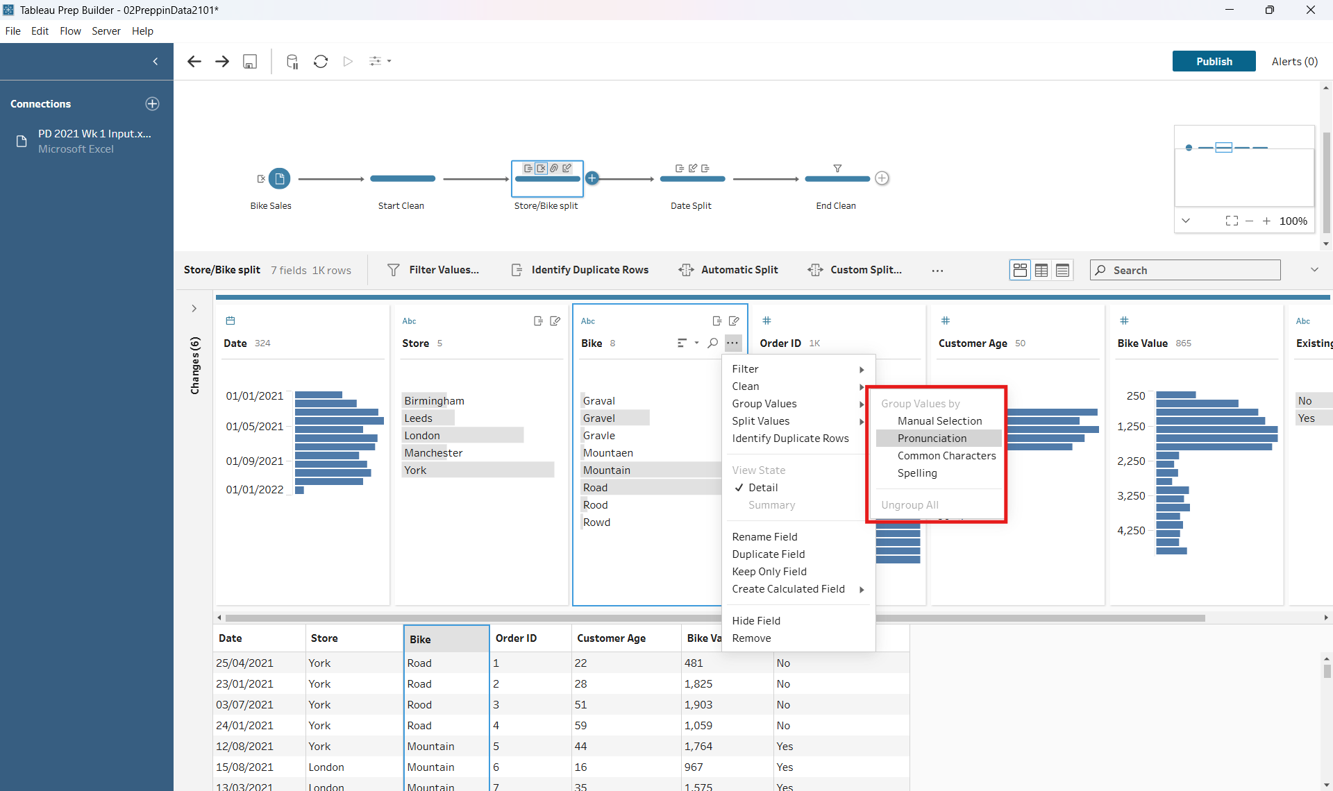 - After this, I cleaned up the spelling mistakes in the Bike Types column. In Tableau Prep this can be done very simply, by using ‘Group Values’ in the drop down and selecting ‘Pronunciation’, ‘Common Characters’ or ‘Spelling’ Usually a combination of these will group the words nicely to clean up any spelling mistakes.