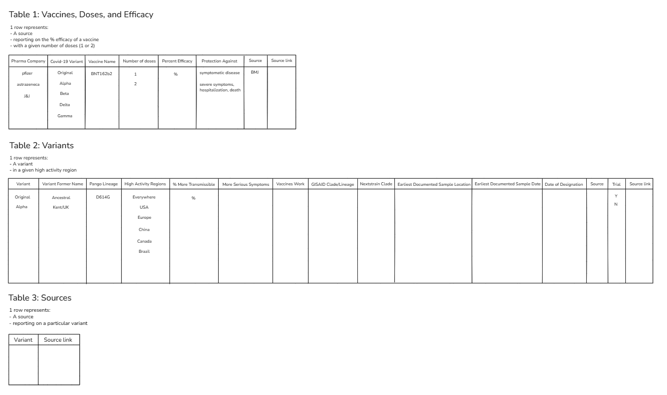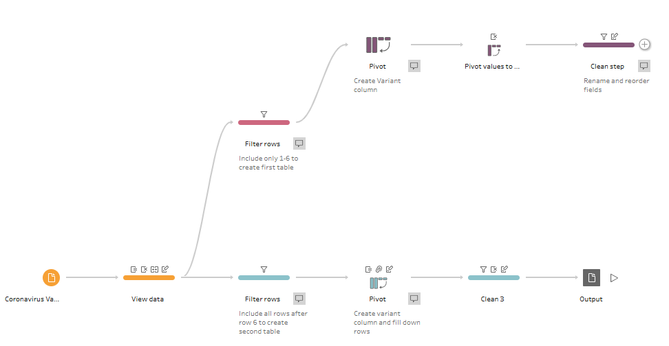 Data tables can be structured quite differently across organizations, teams, and users. For analytics, it's important that data is structured in a clean, tabular format, with each column representing a different field and each row having a clear meaning (e.g., one product for one order). One of the many responsibilities of a data analytics consultant is transforming data to make it ready for use in analytics tools. In this blog I'll explain my process for transforming data on Covid-19 variants and vaccines (source) to the long, narrow data format we love using in Tableau.