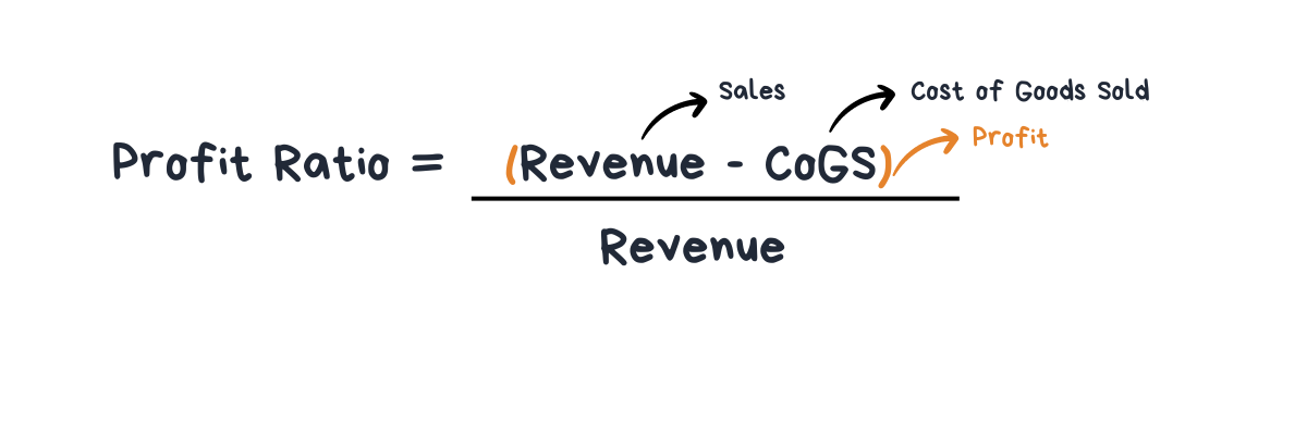 Profit ratio, or profit margin, is the division between the profit and revenue of a company. It shows the profit a company makes per dollar of revenue. For example, if a company has a profit ratio of 0.1, or 10%, it means that for every 1 dollar of sales, it earns 10 cents of profit. The profit ratio is calculated as shown in the expression below.