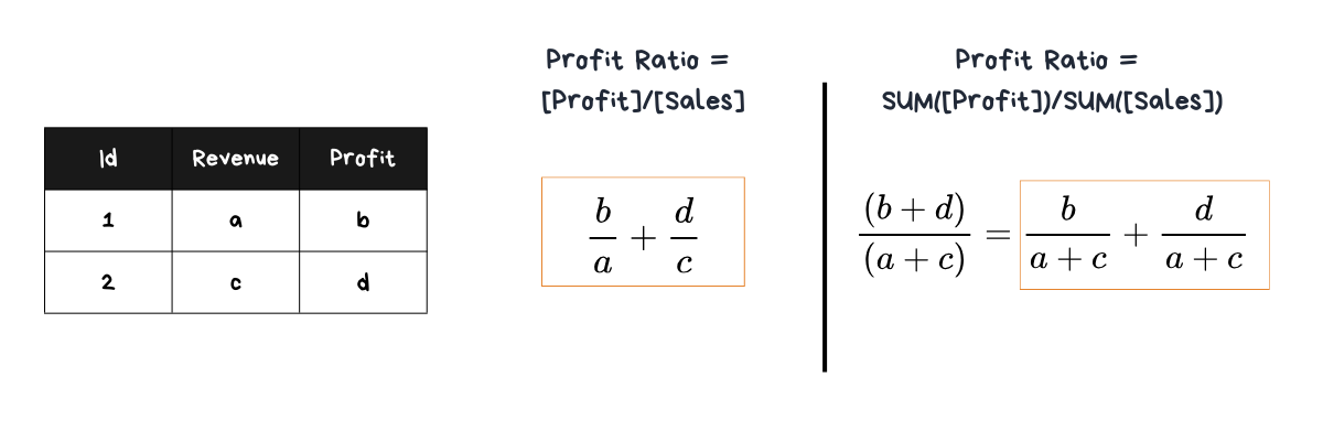Since there is no aggregation function, Tableau will calculate the profit ratio for every row in your data. If you go ahead and use this field in a visualization where Tableau aggregates it with a sum, it will actually execute your calculated field (division) and then sum the results. However, what we want is to first sum all profits and revenues and then divide them.
