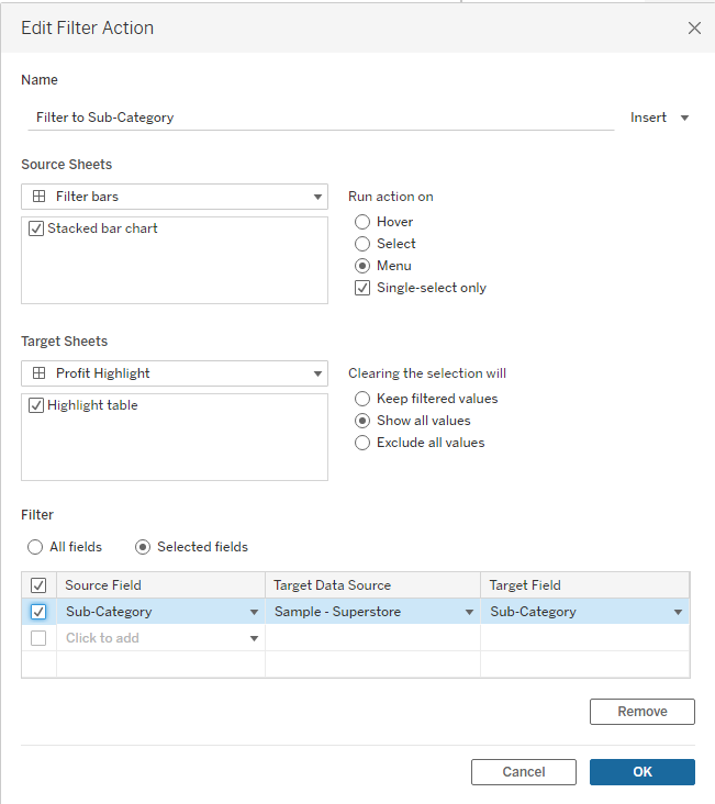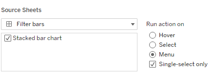 I am going to configure my Dashboard action as a filter action, with the bar chart as the Source and the heatmap as the Target, and choose the single-select 'Menu' option to run this action. I will choose Sub-Category for the 'Selected Field' option: