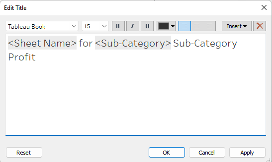 To signpost this clearly for the user, so that they can be sure of what values they are looking at, we can add a dynamic title. In the 'Edit Title' popup, go to 'Insert' and select the Sub-Category field. This will be filtered like the heatmap, and only include the name of the selected bar:
