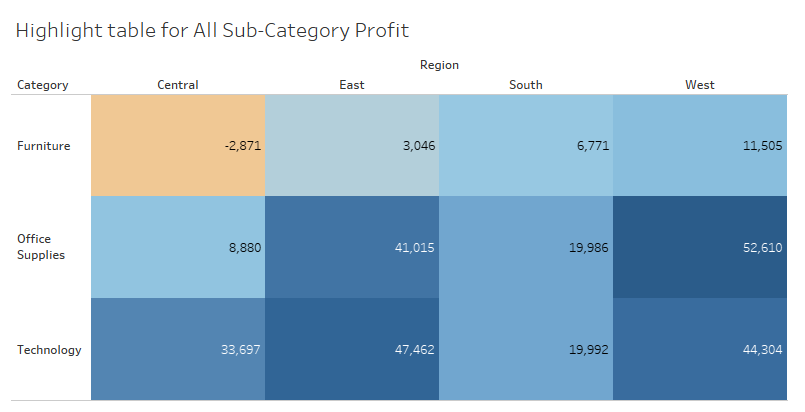 We are working with two very simple Dashboards: one contains a bar graph of all Sales by Sub-Category, and another contains a heatmap showing Profit by Region:
