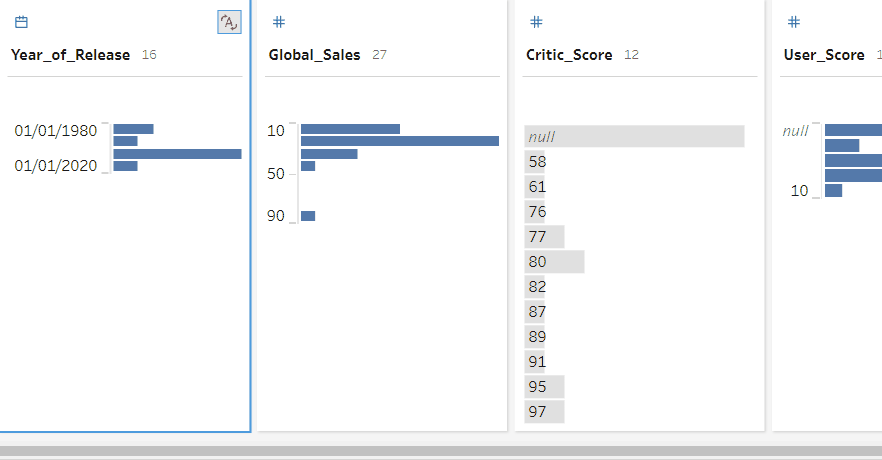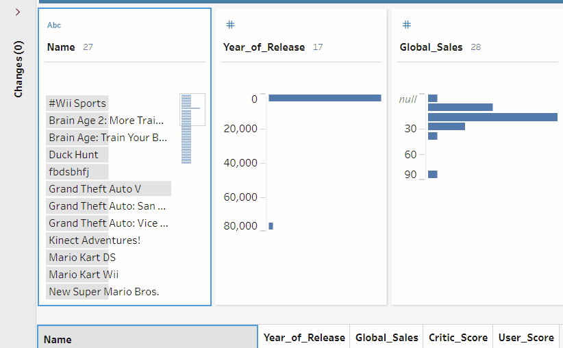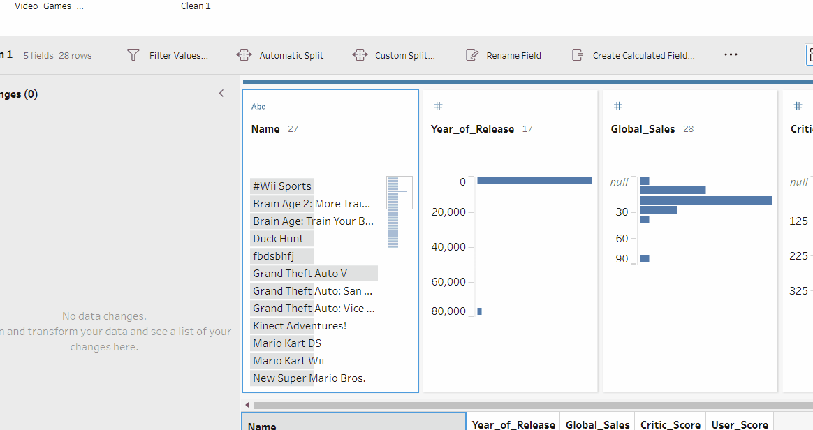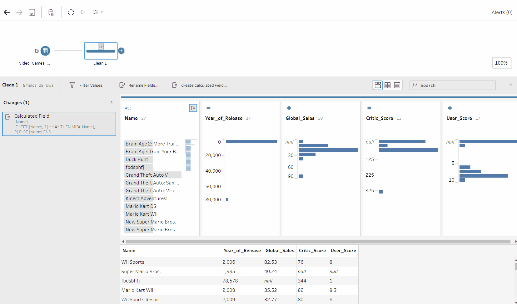 In this case, this is not useful as we have titles such as "Kinect Adventures!" that do use punctuation. In that case, we want to clean the data using a "calculated field" which can be described as a piece of code or algorithm that will look for cells starting with a "#" and removing it, since we know that no game will start with "#".