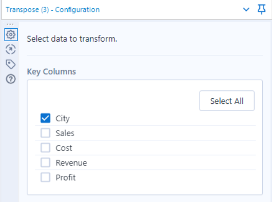 The first step is to choose what we want to group our data by, this is essentially the "key column" option in the transpose tool, where this column won't change and all our data and its values will be grouped for each city
