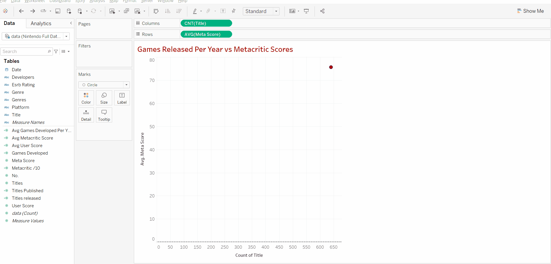 Luckily we can transform the title data into quantitative data by adding a simple measure, "count". This can be done by clicking on the arrow on our Title "pill". Adding a count measure means tableau will count every individual title in the dataset and provide a total number for the number of games that have been counted.