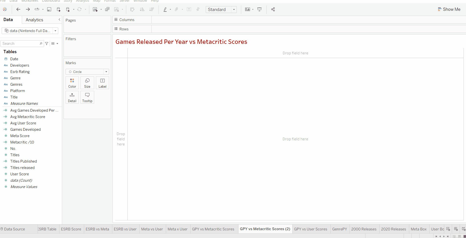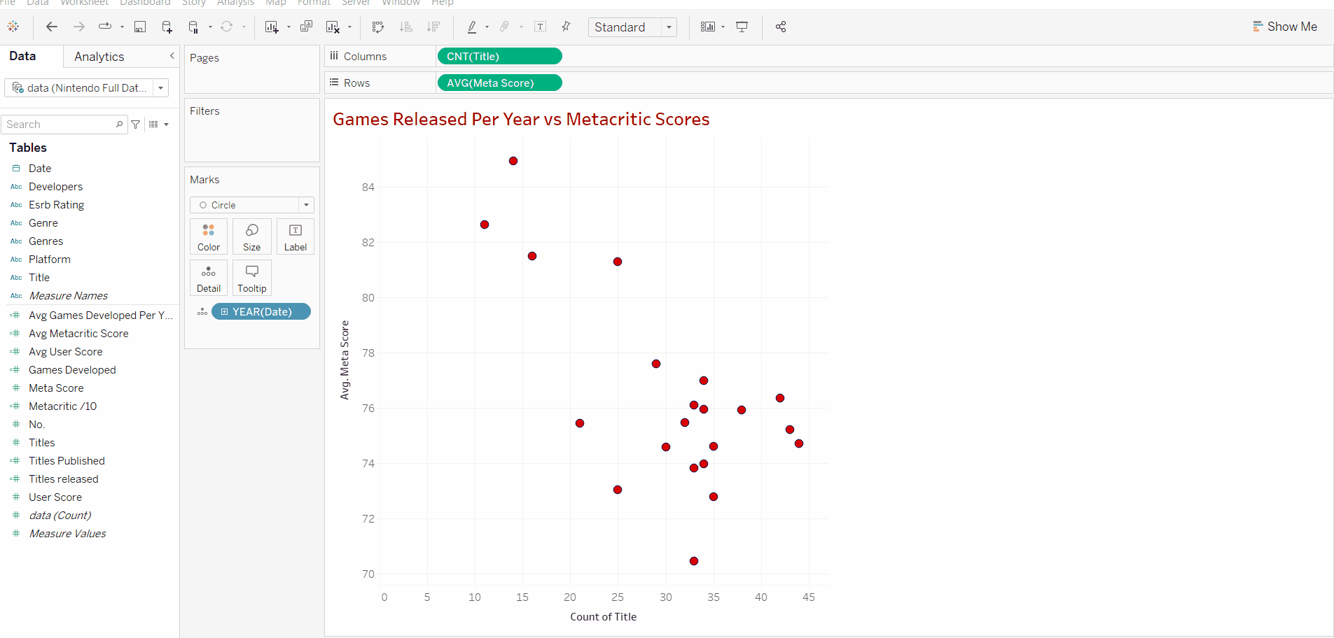 Now that we have our 2 variables we can add our discrete measure. In this case, we are using the year of release. Adding this will create a data point for each year that's in our data set, this data point will include the number of titles released that year alongside the average score for that year's titles.