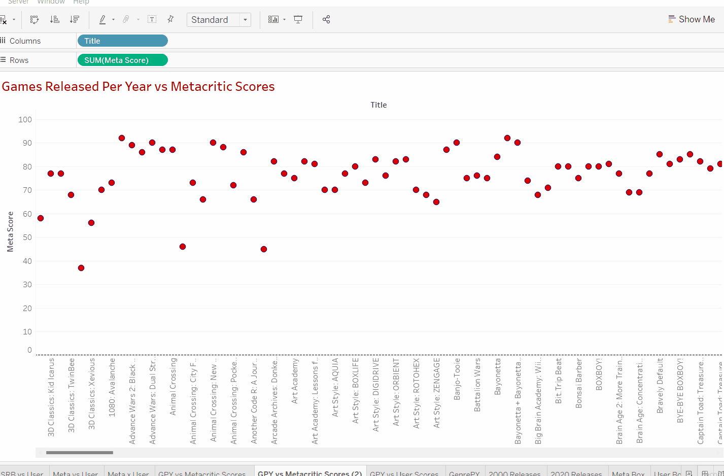 Now we find a new problem, our scores have changed from 0-100 all the way to 48,000. This is because if we look at our row data we can see that tableau defaults to summing the meta scores. This can just be changed by clicking on the arrow on the pill and switching from the sum to average. This way when we add the years in we can see the average score in that year in relationship to "x" number of releases.