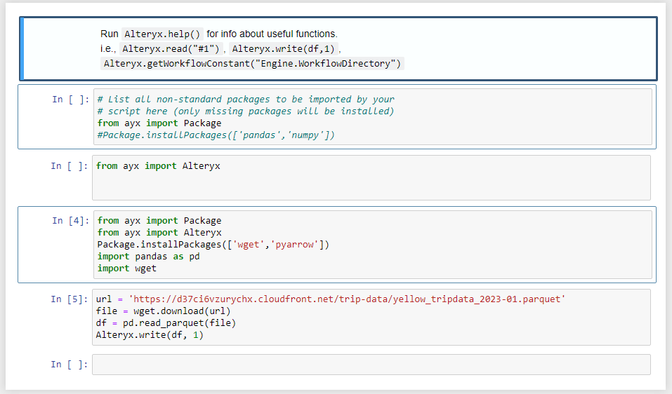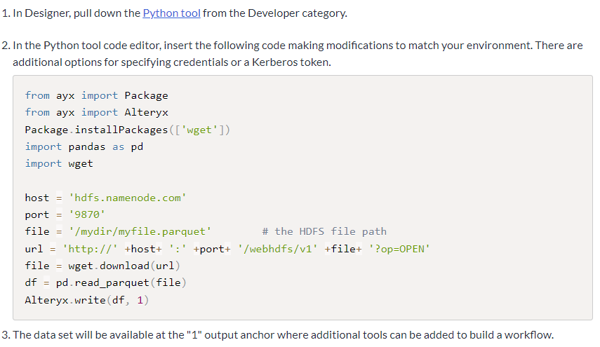 The main problem so far has been that the datasets are in .parquet format, which Alteryx doesn't have native functionality to handle. Using my Google-Fu, I found a blog on the Alteryx community called "Parquet, will it Alteryx?" to help. It gave the following instructions: