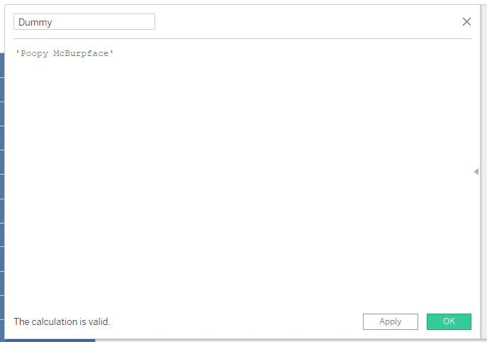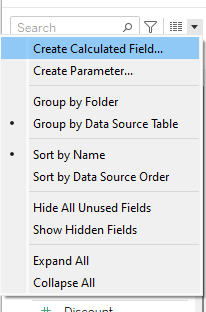 - Click the down arrow in the data pane and select "Create Calculated Field." I'll call mine "Dummy," but you can call it anything you want.