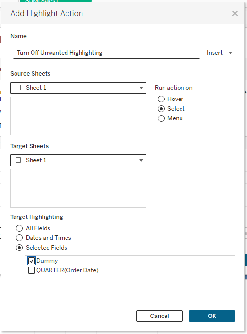 - Set "Target Highlighting" to "Selected Fields" and then select only your dummy variable.