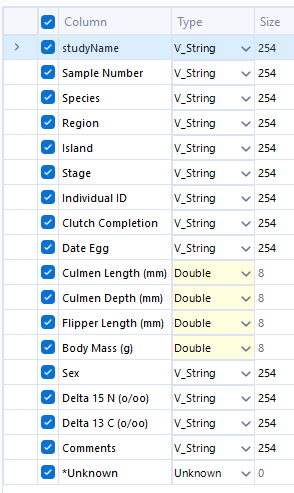 - After inputting the data, we drag a select tool to ensure the fields are the correct data types. As they are currently incorrect, we adjust the fields "Culmen Length, Depth, Flipper Length and Body Mass" to be the double data type.