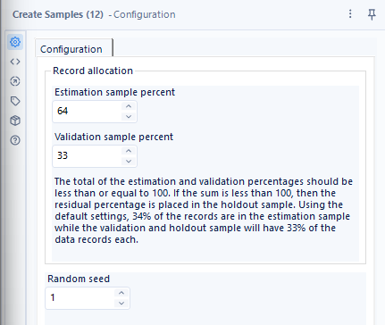 - After this, we introduce the Create Samples Tool, which helps to take a random sample of rows for the estimation. This ensures the sample is representative of the population data, and allows for more reliable inferences. For this test, we set the following parameters. This specifies the percentage of rows that are desired in the estimation and validation samples.