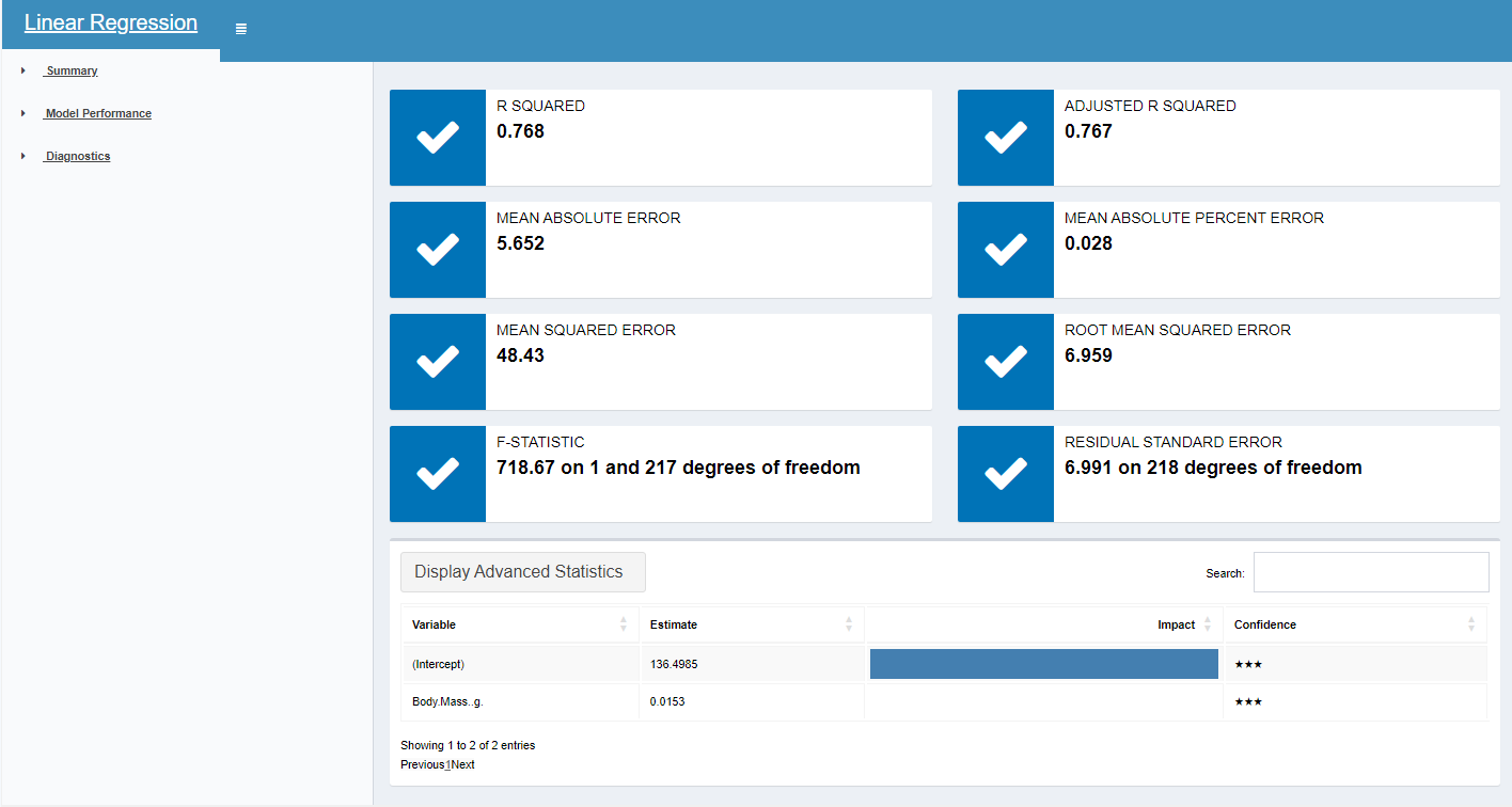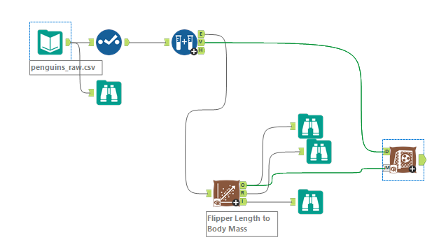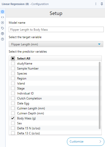 - Dragging in the Linear Regression tool, we use this to evaluate the relationships between variables based on a linear relationship. After naming the model, a target variable (or dependent variable) of Flipper Length is selected. The predictor variable (independent variable) of Body Mass is selected.