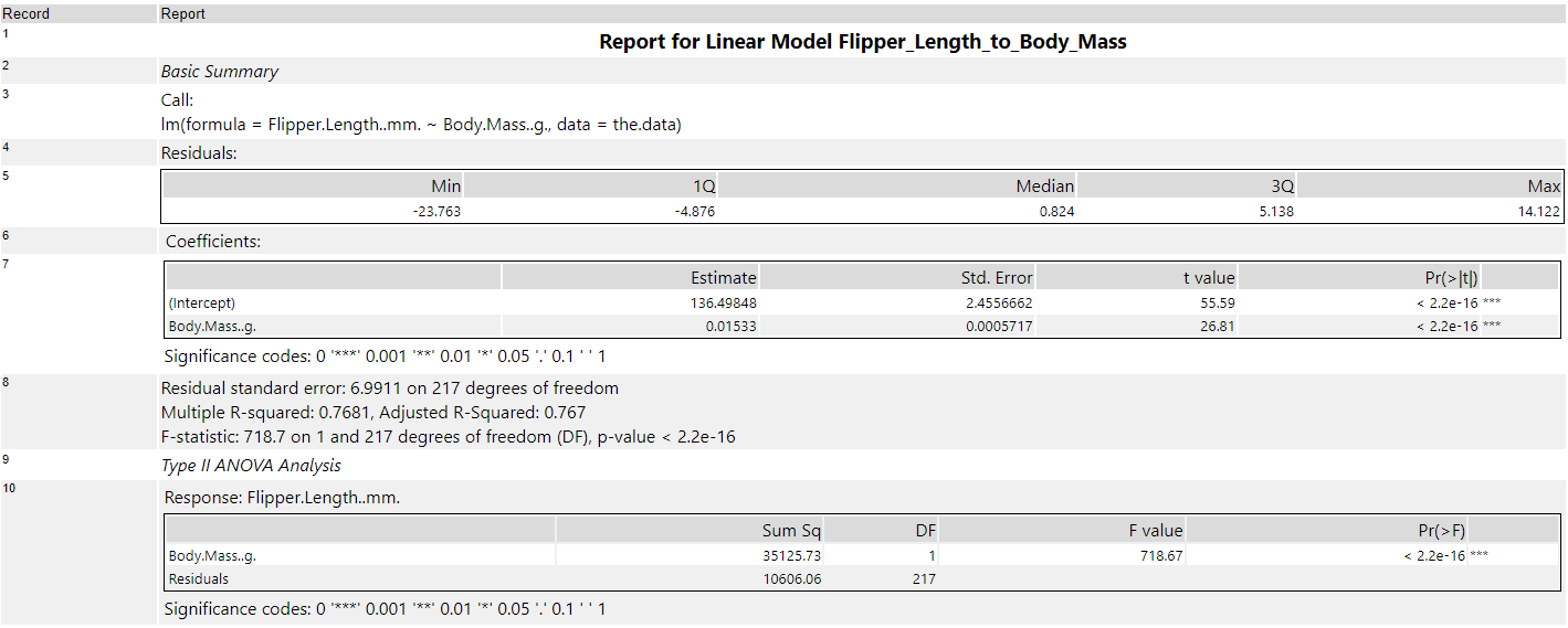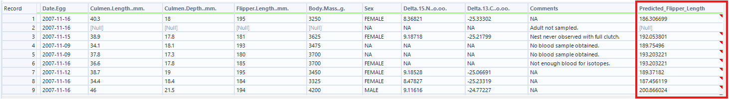 In the output, we see the Predicted Flipper Length added to the dataset at the end.