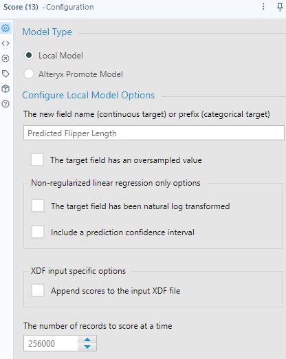 The inputs required are a model object produce by a predictive tool (the O anchor of the Regression tool) to the M input connector, and then a data stream that contains the predictor fields selected (V output from the sample tool to the D input). The configuration panel is simple in this case, as we will use the Local Model. We add a new name for the field name as "Predicted Flipper Length".