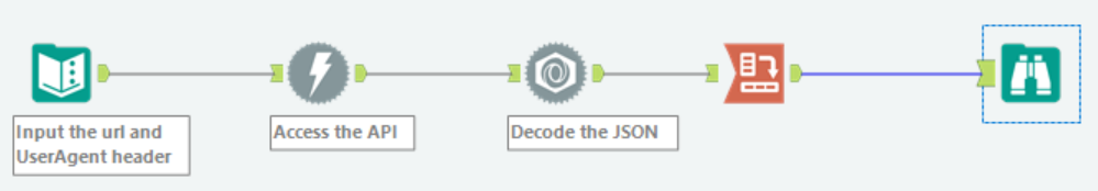 Web scraping proved to be a far more difficult endeavor than the APIs. Especially because different websites will have their HTML written in different ways, and delineate the sections differently, it makes it a much more time consuming process that does not have a one size fits all solution (I know that practicing how to read structures and understanding common patterns will make this process much easier as time goes). The process is similar in using a text input tool for the URL and then a Download tool to obtain the HTML code of the webpage into a cell. Afterwards, you can breakdown the HTML code into multiple rows after each line break, and browse the code next tot the web page to try and identify patterns to extract the data you want from the webpage. Through the use of Filters, RegEx and other tools such as CrossTab to get the data into a desired form. If you would like to learn more about how to web scrape in Alteryx, click here.
