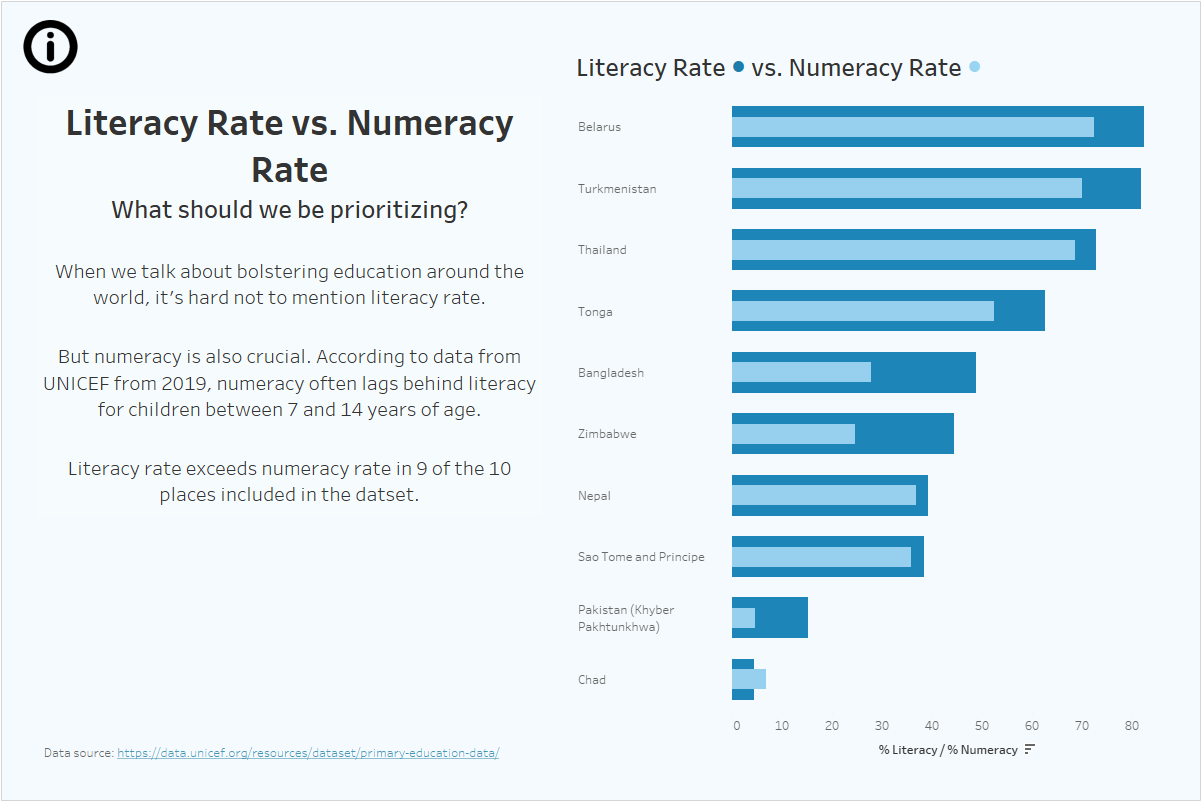 Literacy is important and shouldn't be sacrificed for numeracy but it does seem like the reverse should also be true. This was an interesting finding that I hadn't expected. I decided to focus on this and make a bar-in-bar chart to show the difference in literacy and numeracy for each country in the dataset. For the sake of consistency, I opted to filter the data to kids 7 to 14 years old in the year 2019 (the year with the most available data). For obvious reasons, I only included the countries/areas where both the numeracy rate and the literacy rate were non-null. Here's a link to the dashboard on Tableau Public.