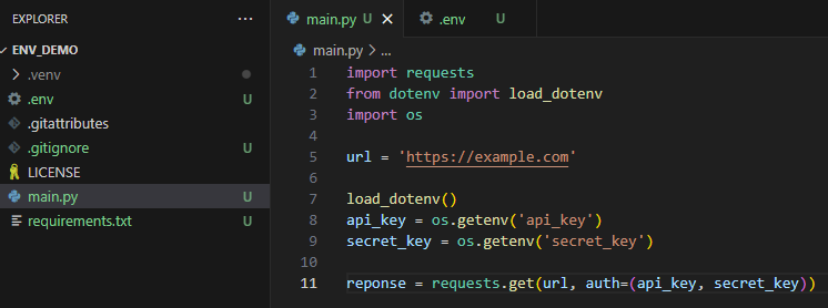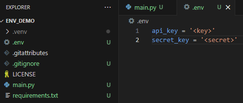 The .env file is where you'll be storing your secrets. Take a look at the repository I've created below, containing a simple Python script in which I download data from an API, authenticating with an API key and a secret key: