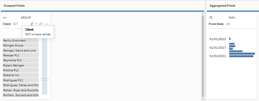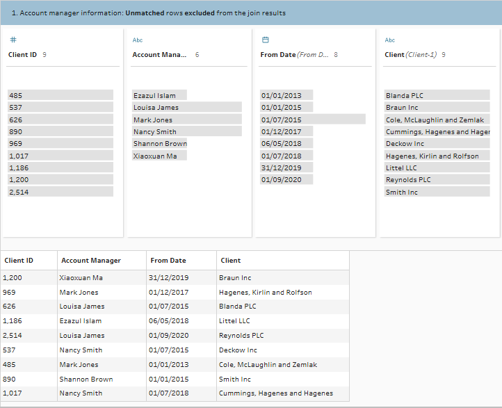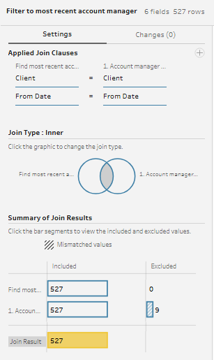 To filter the data, we join this aggregate containing the most recent From Date back to the previous aggregate containing account manager data using an inner join. The joining clauses will be: Client = Client (client name to client name) and From Date = From Date (most recent From Date matched to all the From Dates we have in our dataset). This ensures that only the latest account manager for each client is kept.