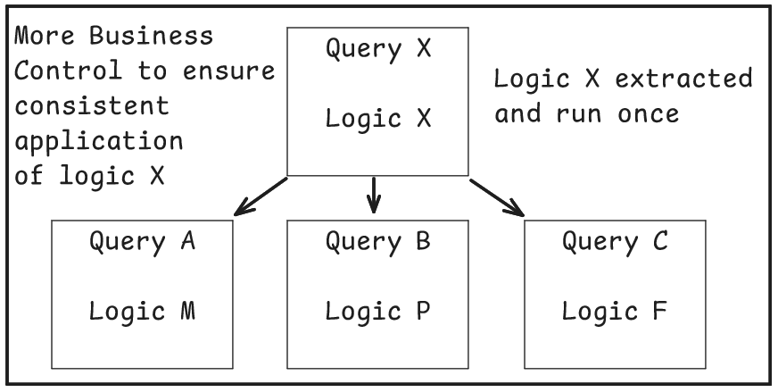 Businesses often have a range of queries across the business to generate tables for different reports. This approach can lead to repeated logic across queries, as each one is tailored for specific reporting needs, but might contain some shared logic creating redundency. -