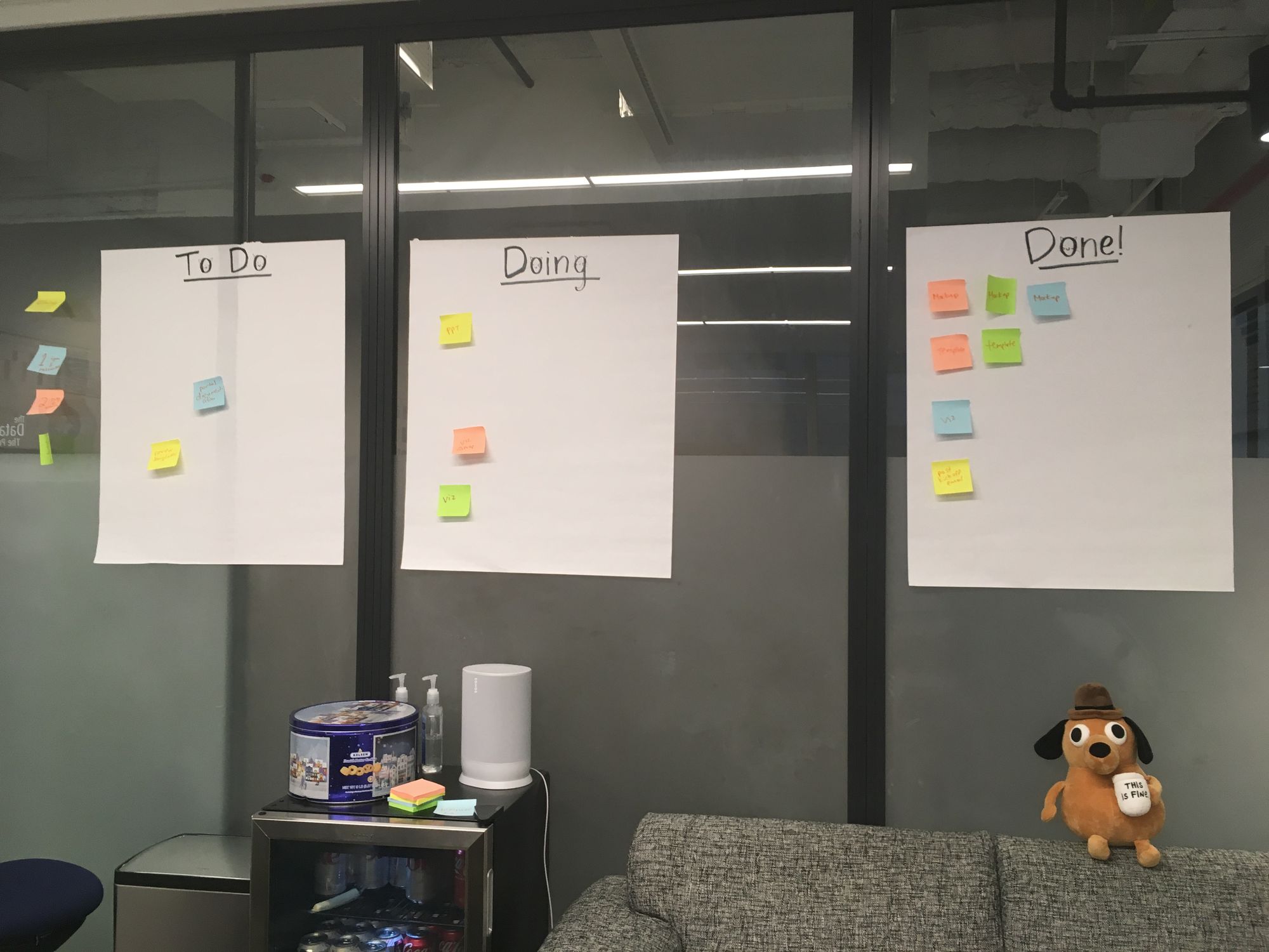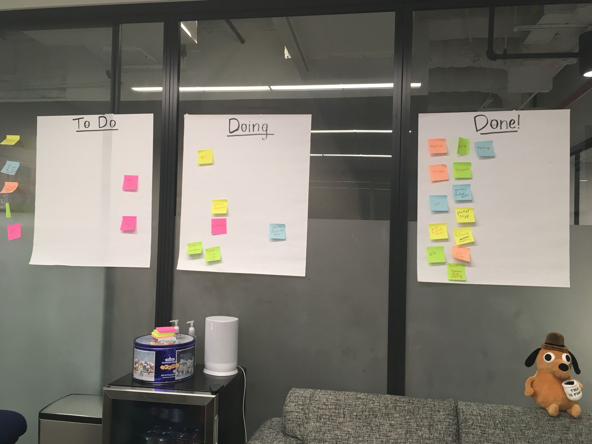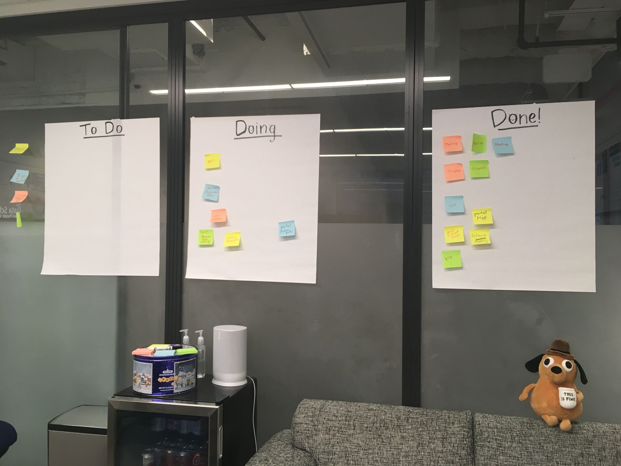 Another goal was to establish more organization; there was certainly organization this week, but was it effective? The daily agenda on the whiteboard was helpful in structuring us. However, the kanban board could have been more useful if it was updated more frequently than once a day. In retrospect, I should have encouraged everyone to freely add and move post-it notes for live updates.