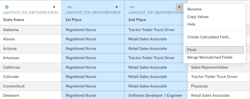 To do this you go to the Data source tab, highlight the columns you would like to pivot and right click and click pivot.