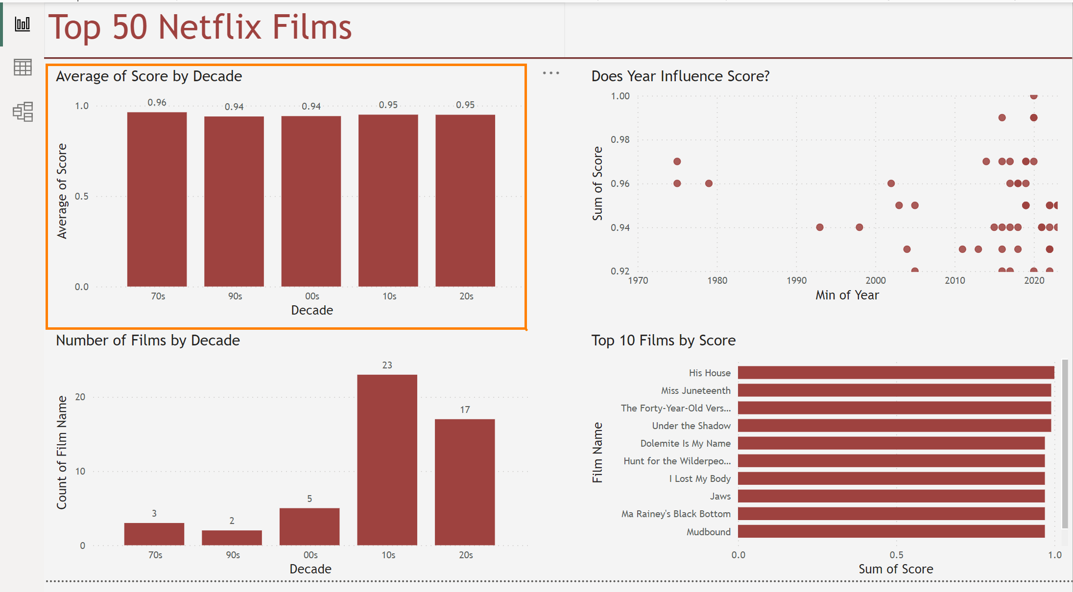 Say, our goal is to create the first chart on this dashboard: Average of Score by Decade