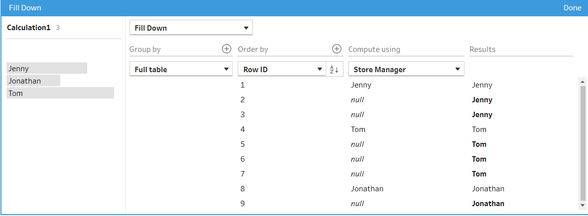 Click the drop-down option on the "Store Manager" field and select Create Calculated Field > Fill Down.