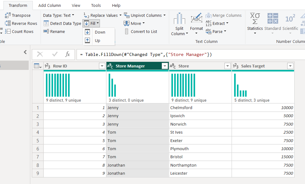 Step 1: From the Transform tab select Fill > Down