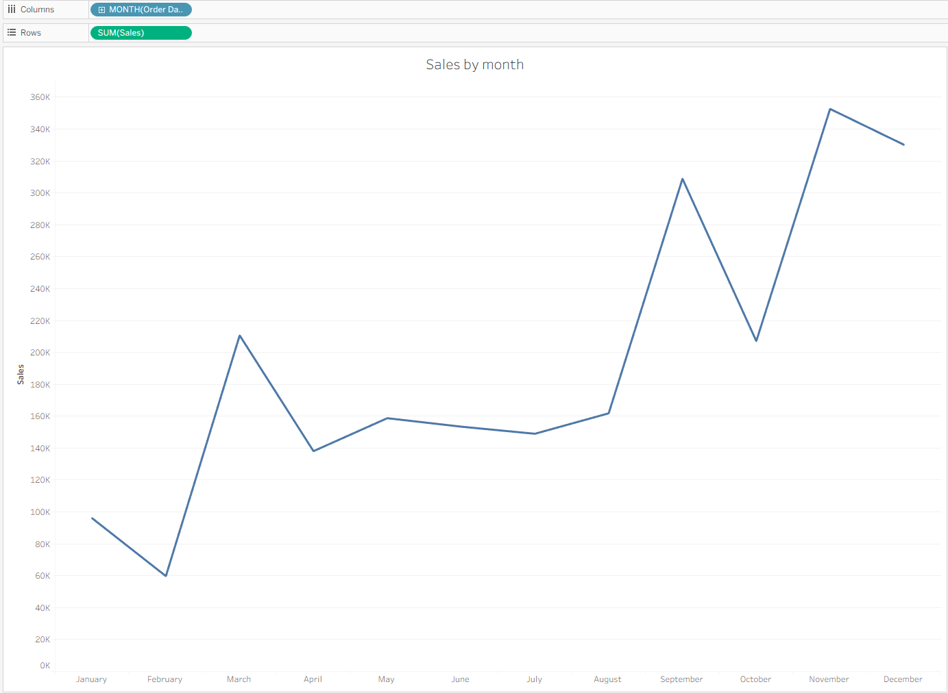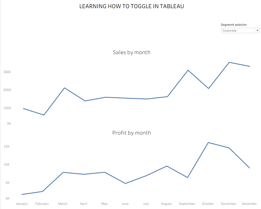 Step 1: Create the charts that you'd like the toggle to work on. As this is only being used as an example, I created two simple sales and profit line charts to evaluate seasonality within different customer segments.