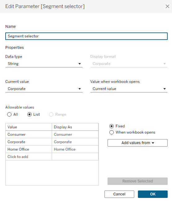 Step 2: Create the parameter to control your toggle. I called mine segment selector but as no-one will be seeing this anyway, you can name it as you like as long as it makes sense to you. I made the data type a string, converted allowable values to list and then added values from the segment field.